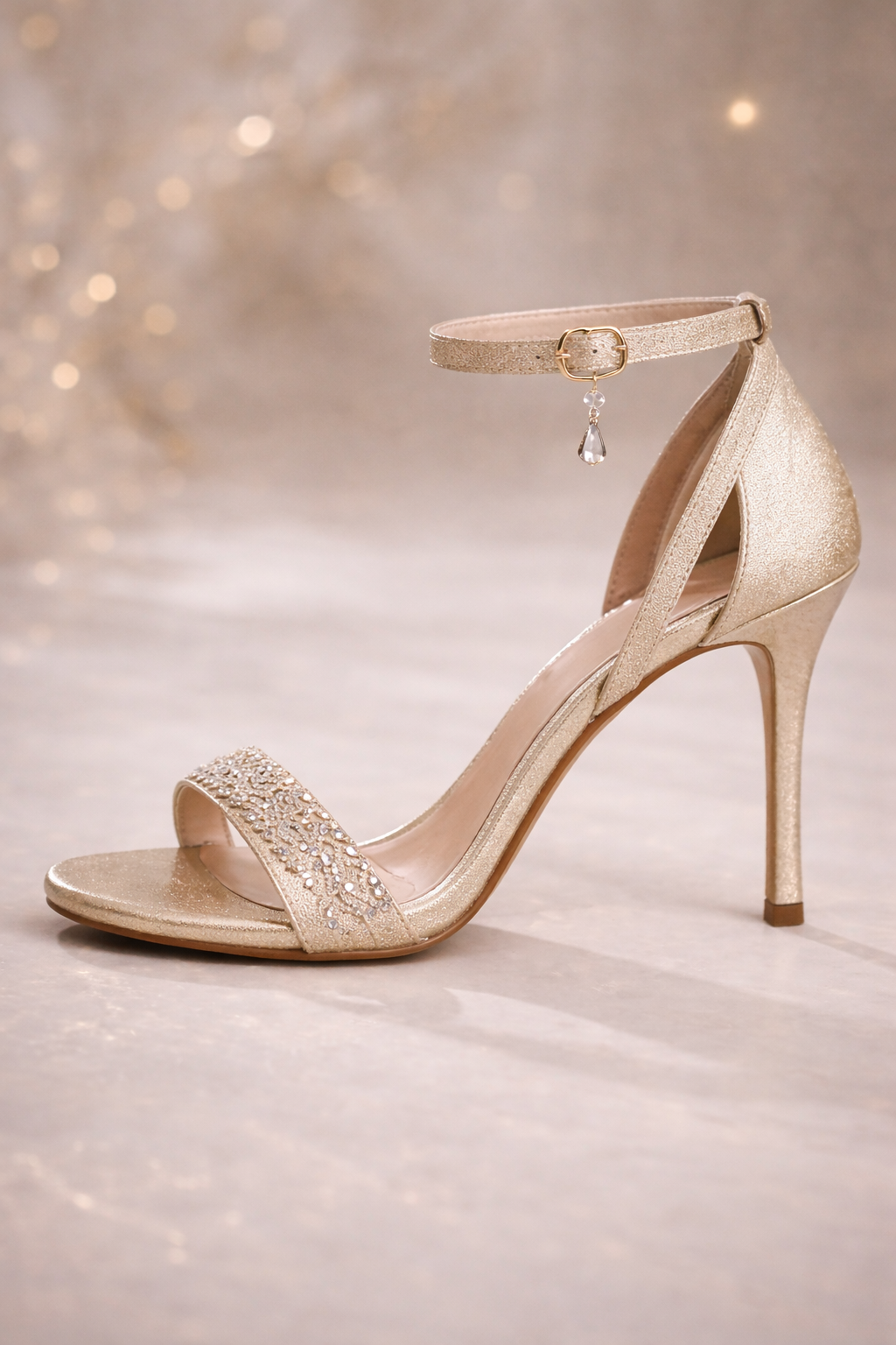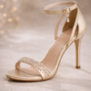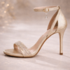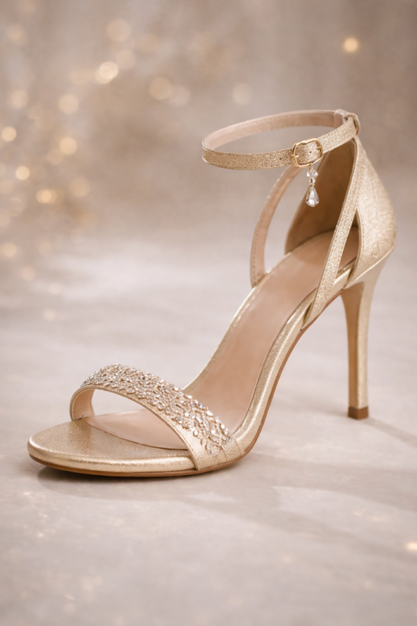Rendered in a soft champagne-gold metallic finish, this elegant open-toe heel features a crystal-embellished front strap that catches the light with every step. Its delicate ankle strap, finished with a subtle crystal charm, adds a touch of femininity while ensuring a secure and graceful fit.