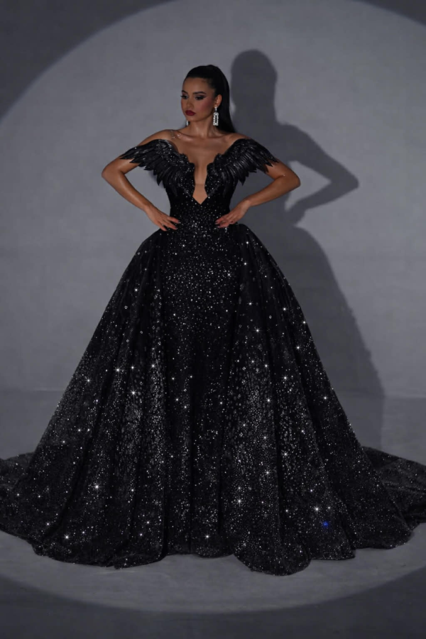 The gown cascades into a voluminous full-length ball skirt, finished in a deep noir shimmer reminiscent of a starlit sky. Subtle luminosity catches the light with every movement, ensuring that every step becomes a moment.